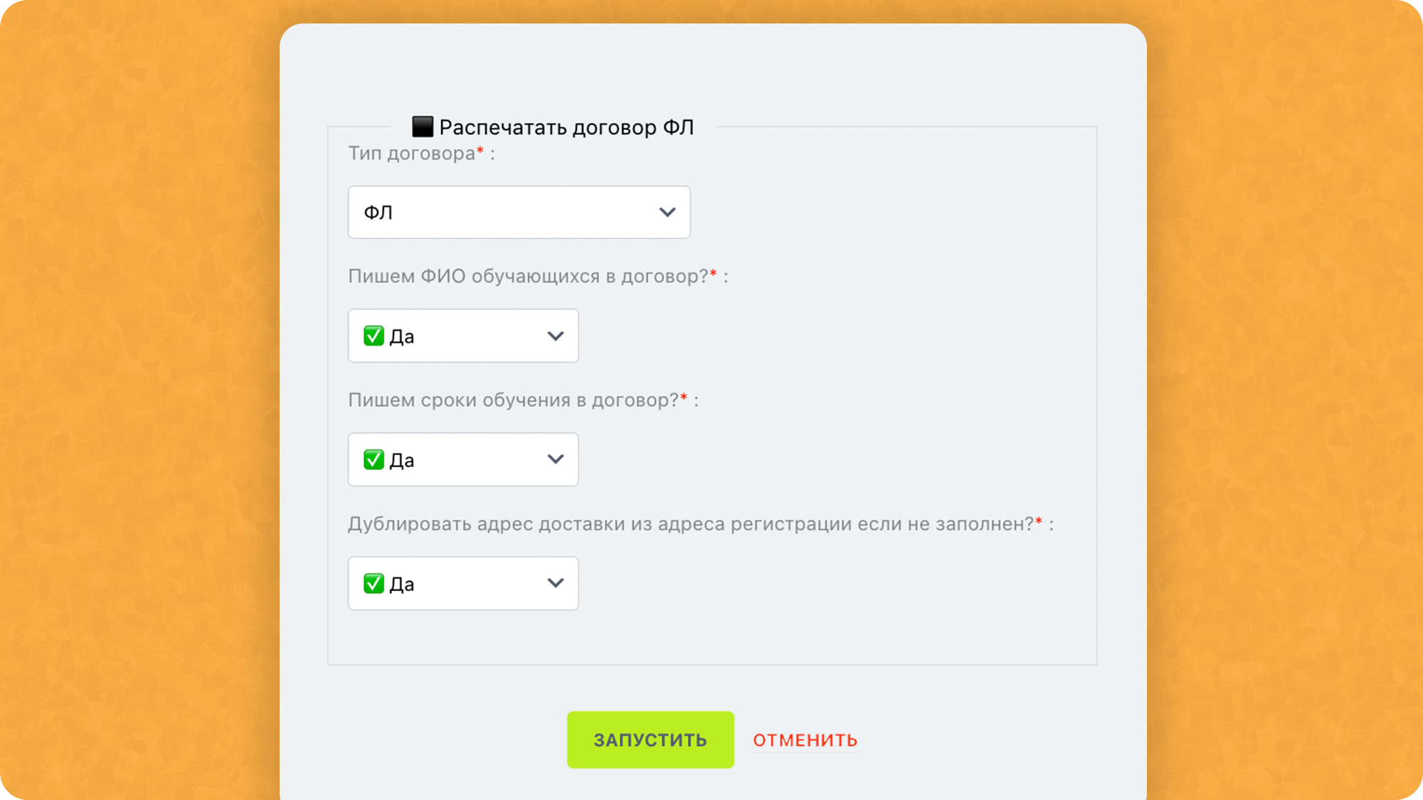 В договоре есть обязательные к заполнению поля. Если одно из них не будет заполнено, система выдаст ошибку и подскажет что нужно исправить.