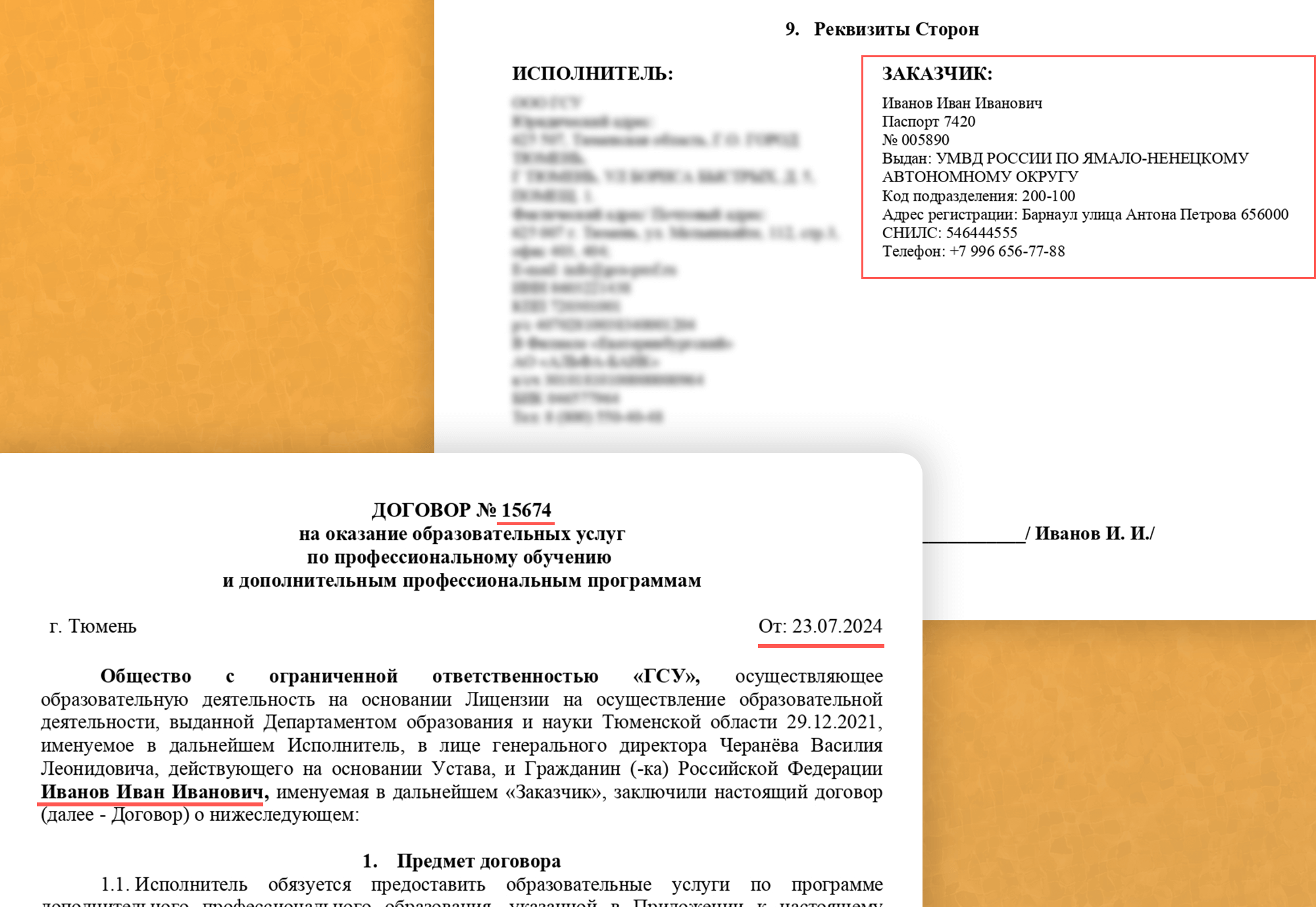 После обработки в реквизиты связанного контакта автоматически добавляются паспортные данные. Отсюда они попадают в договор.